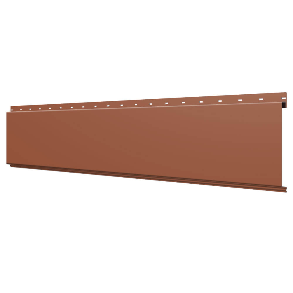 Линеарная потолочно-стеновая панель ГЛАДКАЯ цвет RAL8004 Терракотовый применяется в качестве софитов для подшивы крыши, наружной и внутренней отделки потолков, стен, фронтонов фасада дома в Уральске.