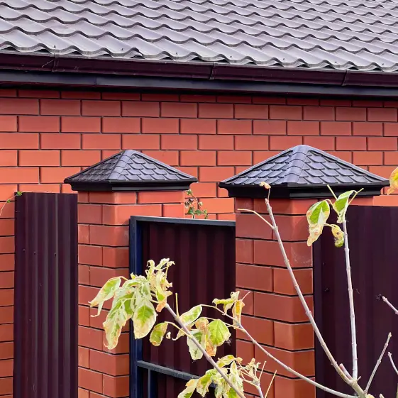 Забор с полимерпесчаным колпаком коллекции Elbrus (Эльбрус) в коричневом цвете, аккуратно установленным на столбах кирпичного забора. Колпак органично подчёркивает фактуру кирпича, создаёт законченный, монолитный вид и выполняет защитную функцию — отводит воду и препятствует разрушению верхних рядов кладки.