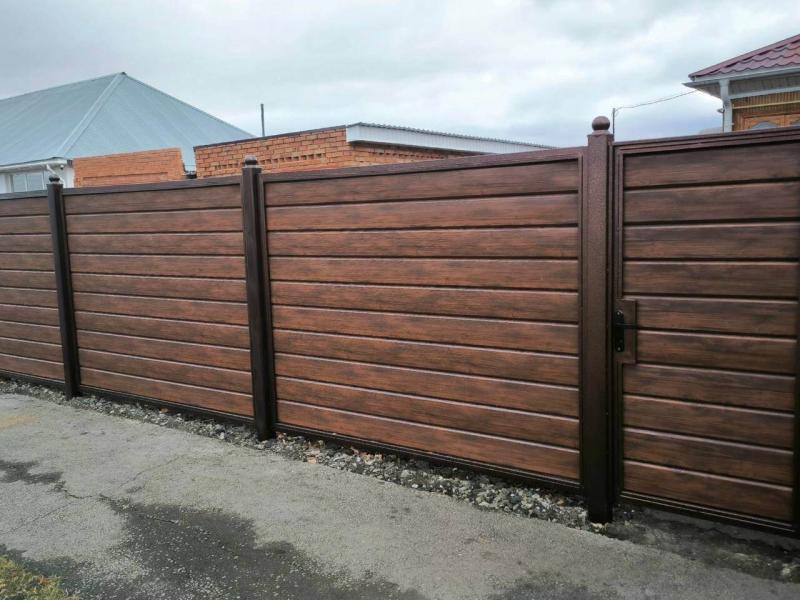 забор из металлического сайдинга в покрытии под дерево