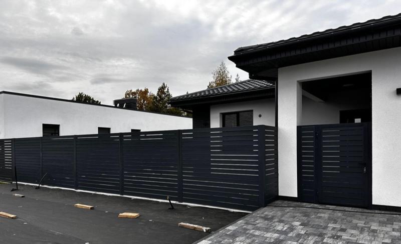 горизонтальный забор из ламелей еврожалюзи и металлического планкена